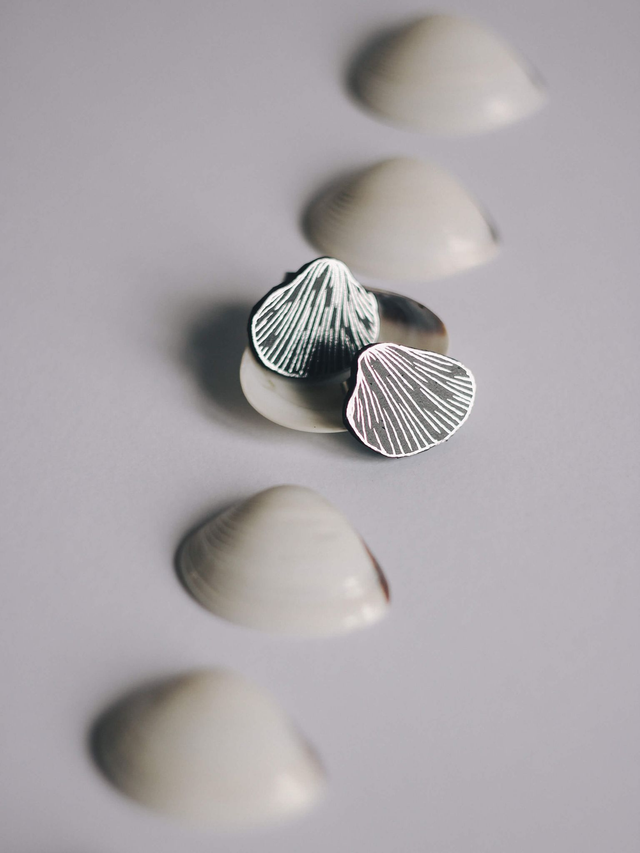 Srebrny wzór muszelki jest przeze mnie odręcznie wykonany, a to sprawia, że każdy kolczyk delikatnie się różni, jest jedyny w swoim rodzaju.