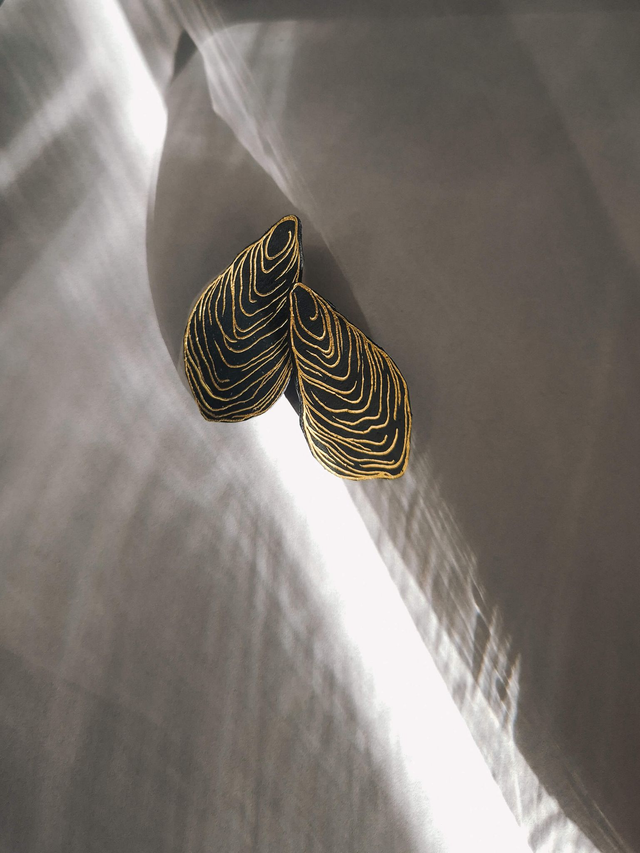 Złoty wzór muszelki jest przeze mnie odręcznie wykonany, a to sprawia, że każdy kolczyk delikatnie się różni, jest jedyny w swoim rodzaju.