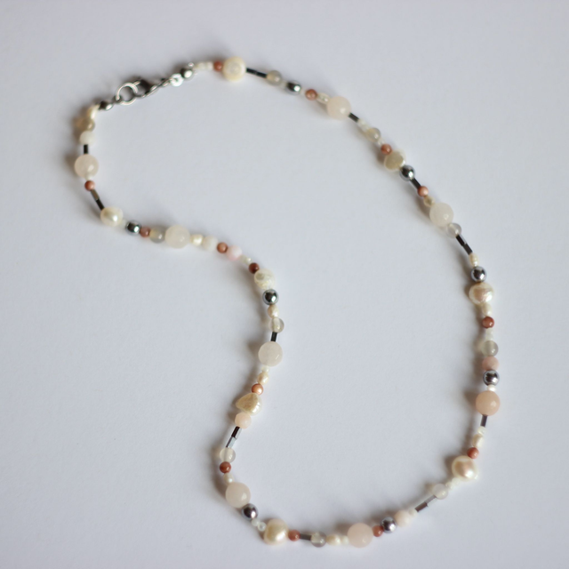 Różowy opal, perły hodowane słodkowodne, agat, muszle, hematyt.