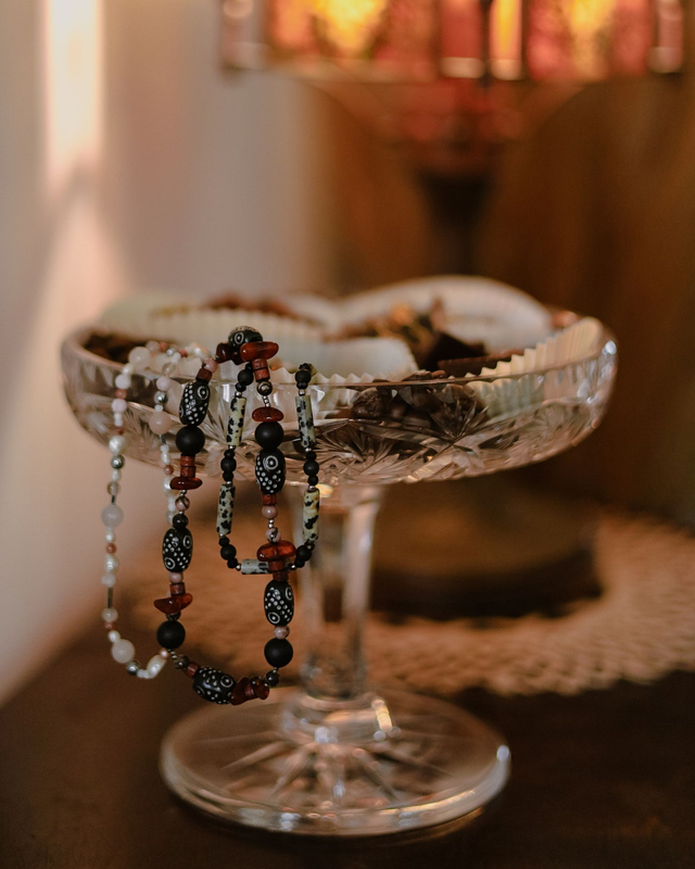 Naszyjnik w odcieniach nude - perłowa biel, ciepły beż, z nutką srebra.